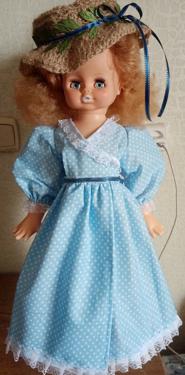 Вместо обуви я сделала валеночки из-за разбитой ножки. А вот одежду в стиле китайского кимоно. Ещё хочется показать куклену, которую сама купила за 50 рублей на рынке это ГДР времен СССР, только лицо наполовину было чёрное, что я только не делала так и не получилось лицо очистить. Дочь закрасила акриловыми красками. Глаза у этой куколки вообще потемнели. Но если честно пока я не знаю как им вернуть былую яркость, может кто подскажет как поступить в таких случаях.