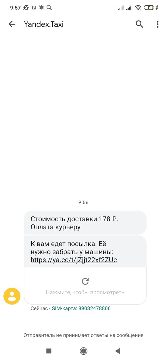 ВОТ ТАКУЮ СМС ПРИСЛАЛИ ЯКОБЫ ЯНДЕКС ДОСТАВКА Как я поняла, что меня пытаются развести: 1) Я не заказывала доставку. 2) Если доставка, то где номер и марка машины? 3) Если это не мошенник, то можно спокойно нажать на Яндекс и выйдет номер телефона, но здесь не кликается ЯНДЕКС! Ну и ссылка совсем не Яндекса! Что будет, если перейти по ссылке? Как правило, на данные вашей карты и дальше уже будет выживание денег. Очень буду рада, если мой пост поможет не попасться. #мошенник #мошенник Яндекс доставка БУДЬТЕ БДИТЕЛЬНЫ! 🗣️👂