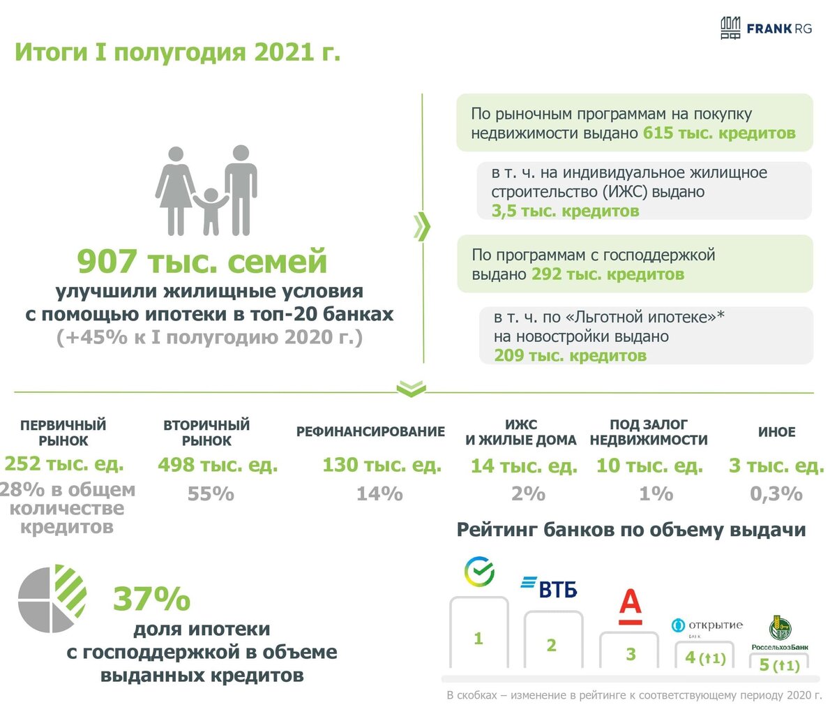 Благодаря совокупным мерам господдержки ипотеки средний заемщик может сэкономить до 2 млн руб. за весь срок кредита - к такому выводу пришли аналитики банка. Расчеты содержатся в очередном профильном отчете по итогам полугодия, подготовленном Аналитическим центром госкорпорации ДОМ.РФ совместно с агентством Frank RG. В работе представлена подробная статистика по реализации в России ипотечных программ господдержки ипотеки (ДОМ.РФ является их оператором) за первые шесть месяцев 2021 года. За этот период: • данными программами воспользовались 292 тыс. российских семей, взявших ипотеку; • общая сумма ипотечных кредитов в рамках программ господдержки составила 959 млрд руб.; свыше 73 тыс. семей получили выплату в 450 тыс. руб. на погашение ипотеки при рождении третьего или последующего ребенка; • в рамках госпрограммы «Льготная ипотека на новостройки» по ставке до 6,5% (со 2 июля — до 7%) ТОП-20 ипотечных банков выдано 208,6 тыс. кредитов; • в рамках госпрограммы «Семейная ипотека» по ста