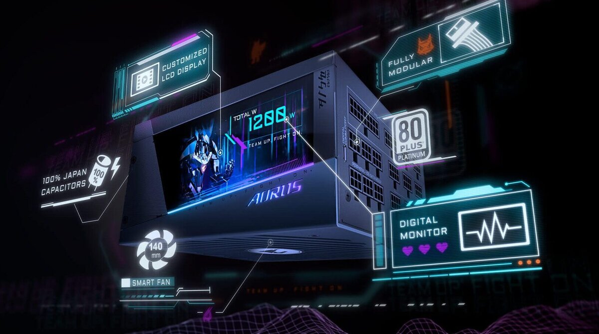 Aorus P1200W – это новый блок питания компьютеры марки Gigabyte, который входит в предложение производителя. Устройство довольно необычное. Компания разместила в нем цветной ЖК-дисплей, на котором можно даже посмотреть видео. Gigabyte Aorus P1200W, созданный для требовательных пользователей компьютеров. Цена или дата выхода блока на рынок пока не указаны. Однако мы знаем, что может предложить новая модель. Gigabyte в Aorus P1200W разместил цветной ЖК-экран, который, безусловно, является элементом, который отличает этот блок питания от других. Дисплей способен отображать персонализированный текст, изображения, GIF и даже видео. Блок с общей мощностью 1200 Вт совместим с 80-Plus Platinum. Здесь установлен 140-мм вентилятор и полностью модульные кабели, активные PFC и японские конденсаторы. Размеры модели составляют 150 x 160 x 86 мм, и благодаря этому блок должен поместиться в большинстве корпусов типа ATX.