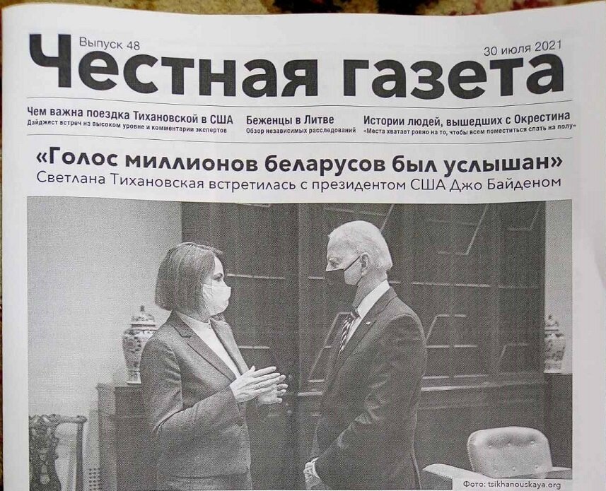 Выходим вчера с женой из дому. В почтовых ящиках распиханы газеты, большая часть уже валяется в коробке для мусора - бумажного спама, который в изобилии появляется у нас в виде рекламных проспектов и объявлений всевозможных видов и размеров. Беру в руки газету. Думаю, будет чем развлечься на лавочке. Может, кроссворд будет... Черта с два. Газета оказалась "рупором оппозиции" под названием "Честная газета". Общий объем - половина обычной газеты, поделенная на восемь страниц. Прогулялись мы с супругой, присели, я закурил. Взял в руки этот "доносчик правды". Ну, ладно, что же они там могут написать, чего я не знаю. Первая страница - огромное фото встречи Байдена с Тихановской и статья с громким названием "Голос миллионов беларусов был услышан". Подзаголовок гласил: Светлана Тихановская встретилась с президентом США Джо Байденом. С ума сойти! (А я как бы и не знал.) Короче, статейка почти целиком из, типа, тезисов самой Печеньки. Подробности встречи? Я тоже ожидал это увидеть, но вскользь