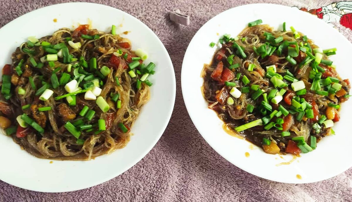 Приветствую мой дорогой читатель . Хочу поделиться на мой взгляд интересным и очень вкусным рецептом фунчоза с морепродуктами . Это блюдо принадлежит азиатским странам . Оно к нам пришло из таких стран как Китай , Корея и Япония . Если честно приготовив это блюдо впервые хочу сказать без всякого преувеличения оно мне очень понравилось . И сейчас я с вами буду делиться этим вкусным рецептом . Для приготовления нам понадобится : сухая лапша фунчоза 100 г это на две порции , морской коктейль 400 г, сладкий болгарский перец 2шт , сухой чеснок , соевый соус и соус сладкий Чили, зелёный лук . На разогретую сковороду с добавлением масла отправляем морской коктейль через 3-5 минут к нему отправляем сладкий болгарский перец нарезанный небольшой соломкой и обжариваем ещё несколько минут . Затем я добавляю небольшое количество соевого соуса и на небольшом нагреве буду томить около 5 минут . Займёмся лапшой фунчоза , из пакета пересылаем в ёмкость и заливаем крутым кипятком , даём настояться под