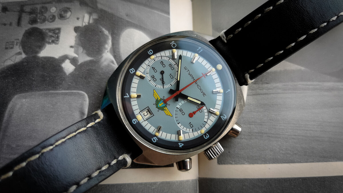 В советское время большое внимание уделялось снабжению различных государственных структур специализированными часам. Выпускались часы для офицеров ВС, военных моряков, подводников, полярников и даже врачей. И само собой не обошли стороной авиацию, в 1949 году на Первом Московском часовом заводе выпустили первые "Штурманские" часы. В моей коллекции есть "Штурманские" часы-хронографы с механизмом 31659, эта модификация выпускалась во второй половине 80-х годов. Отличительная особенность этого механизма - наличие функции "стоп-секунда", при вытягивании ЗГ для установки времени, секундная стрелка останавливается, что позволяет выставить время точно. Секундная стрелка часов находится слева на дополнительном циферблате (черная), а секундная стрелка секундомера в середине. Справа расположен циферблат секундомера с минутной стрелкой (красная). Внизу расположено окошко отображения текущей даты. На правой стороне расположена заводная головка и две кнопки управления секундомером. Стекло плоское,