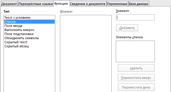 Поле «Список» в тексте документа показывает только один из своих элементов. Для изменения отображаемого элемента нужно щёлкнуть по нему и появится небольшое окно «Выбор элемента», в котором нужно выбрать нужное и нажать кнопку «ОК»: