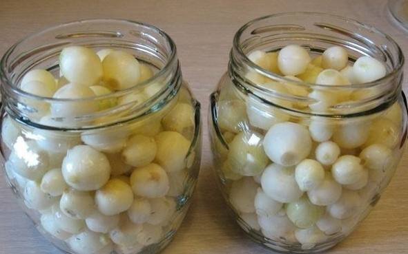 Заготовки - лук маринованный Взять самый мелкий лук, очистить, ошпарить кипятком, уложить в стерилизованные банки. Можно добавить несколько долек чеснока и стручок острого перца, кто любит. Если есть веточку петрушки. Для маринада: на 1 л воды, 1ст.л сахара, 1 ст. л. соли, 1 ст.л. уксусной кислоты или 7 ложек уксуса(лучше конечно яблочный или винный уксус), немного черного перца горошком и кориандра,зёрна горчицы, можно положить пару гвоздичин. Маринад вскипятить и залить им лук. Банки стерилизовать в воде 15 минут, закатать. Такой лук совсем не горький, похож на хрустящий огурец. Хорошо идет как закуска или как гарнир к мясу. Хранится долго.