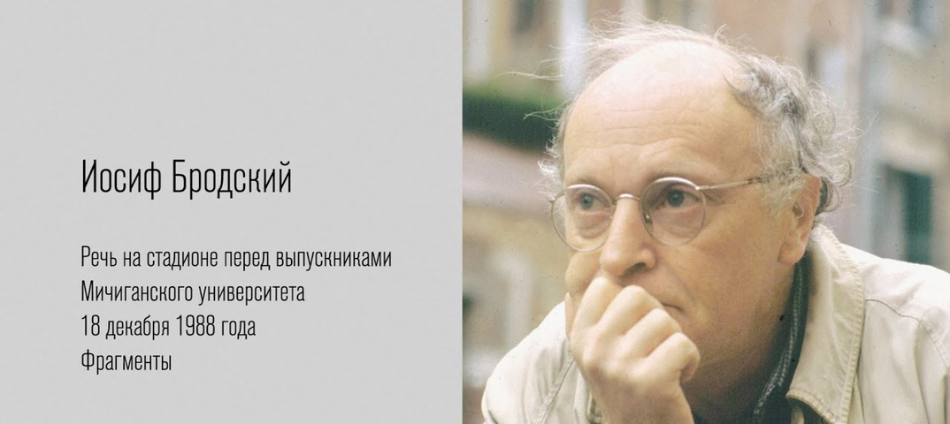 Мой любимый поэт Иосиф Бродский в 1988 году произнес речь перед выпускниками Мичиганского Университета, которую я постоянно перечитываю, так ка считаю, что в ней заключена огромная мудрость и правила жизни, которые пригодятся всем. Сегодня я хотела бы поделиться выдержками из этой речи. Надеюсь, друзья, она будет интересна и полезна вам всем, и в трудные минуты жизни вы будете к ней обращаться, и она поможет вам так же, как помогает и мне... Жизнь — игра со многими правилами, но без рефери. Мы узнаем, как в нее играть, скорее наблюдая ее, нежели справляясь в какой-нибудь книге, включая Священное Писание. Поэтому неудивительно, что столь многие играют нечестно, столь немногие выигрывают, столь многие проигрывают. И теперь и в дальнейшем, я думаю, имеет, смысл сосредоточиться на точности вашего языка. Старайтесь расширять свой словарь и обращаться с ним так, как вы обращаетесь с вашим банковским счетом. Уделяйте ему много внимания и старайтесь увеличить свои дивиденды. Цель здесь не