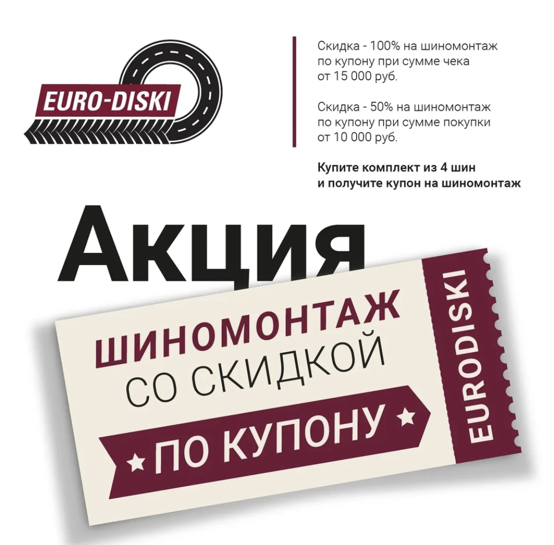 КУПОН НА ШИНОМОНТАЖ В ЕВРО-ДИСКАХ 1 заказ ➡️ 1 купон ➡️ 1 автомобиль ЕВРО-ДИСКИ. УДОБНЫЙ.ИНТЕРНЕТ.МАГАЗИН. Мы более 15 лет занимаемся продажей авто и мото шин, а также колёсными дисками. Купон дает право на скидку от 50 до 100% на услуги шиномонтажа в шинных центрах компании Евро-диски, а также на Пунктах выдачи у парнеров. ⠀ УСЛОВИЯ ВЫПОЛНЕНИЯ ШИНОМОНТАЖНЫХ РАБОТ: ☑️ Единоразово; ☑️ Строго на приобретенный товар; ☑️ Применительно на 1 автомобиль не более 5 колес. 4+1 запасное, при необходимости 😀 ☑️ Воспользоваться купоном можно в течение 30 дней с момента получения заказа. ⠀ СХЕМА ДЕЙСТВИЙ 1️⃣ Совершаете покупку в магазине ЕВРО-ДИСКИ 2️⃣ Записываетесь на шиномонтаж 3️⃣ Получаете скидку или бесплатный шиномонтаж ⠀ СКИДКА ЗАВИСИТ ОТ СУММЫ ЗАКАЗА ⠀ 👉🏻МОНТАЖ ПЛАТНЫЙ Сумма вашего заказа составила менее 10 000 Р ⠀ 👉🏻-50% СКИДКА НА МОНТАЖ Сумма вашего заказа составила от 10 000 Р до 15 000 Р ⠀ 👉🏻МОНТАЖ БЕСПЛАТНЫЙ Сумма вашего заказа составила от 15 000 Р и более ⠀ БЕСПЛАТНЫЙ ШИНО