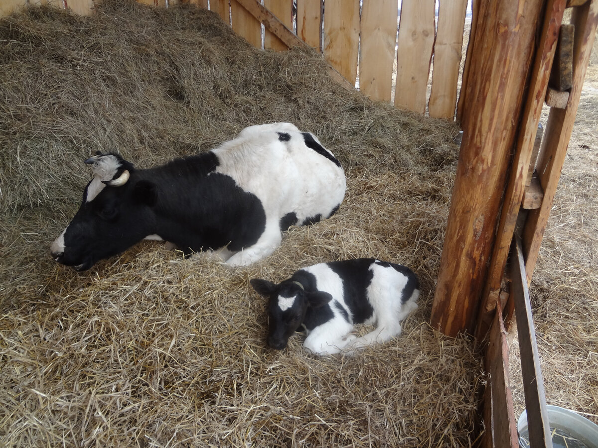 Моя телка Милочка родилась 8-го апреля, т.е., уже почти четыре месяца назад. Все произошло очень быстро. Я видела, что Ждана готовится, но закрывать ее не стала, так как на улице было достаточно тепло. Около семи утра корова отправилась к лежанке за соломой, где рожала и в прошлом году, а через час вокруг нее уже бегала новорожденная телочка. Я решила не разлучать их: апрель, еще могло быть прохладно, подумала, пусть уж лучше будет вместе с матерью – т.е., первый раз в жизни оставила теленка на подсосе. Мне казалось, что это – стопроцентная гарантия, чтобы все было в порядке. Но, на следующий день, услышала, как Ждана что-то подозрительно громко мычит. Пошла посмотреть, в чем дело – Милка лежит на боку без движения, как мертвая. Оказалось – это просто запор (вот я не ожидала!) Навоз начал выходить из кишечника и застрял на пол пути, а у Милки уже не было сил освободиться. Как смогла, помогла ей, и все сделала правильно: телочка, как ни в чем не бывало, вскочила на ножки. После подсоса