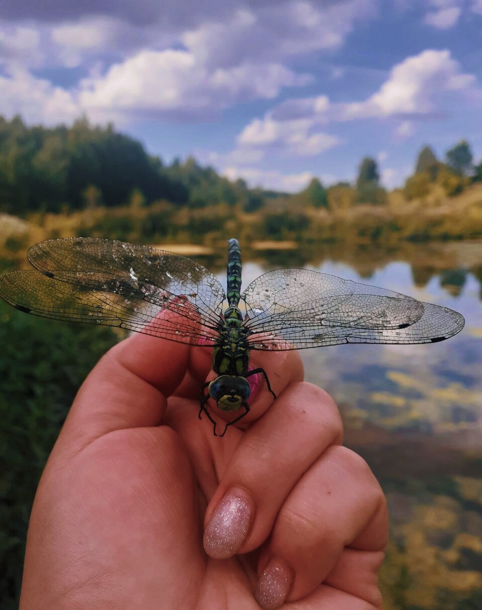 Спасение Стрекозы Марго. Почему Марго? Это первое , что пришло мне на ум , когда я увидела ее почти бездыханную в воде маленького озерца. Взяв осторожно в руки стрекозку ,внимательно разглядываю и понимаю она жива. Ура!!! Обсушив свои крылышки , она ещё пару минут в благодарность за спасение посидела на моей руке, дав собой полюбоваться. Мгновение .... и Марго улетела . Я рада, да я спасла стрекозу. Всё! Финал одного прекрасного вечера августа. #стрекоза #мирвкоторомяживу #красота #природа #август2021 #любитьжизнь #берегитеприроду