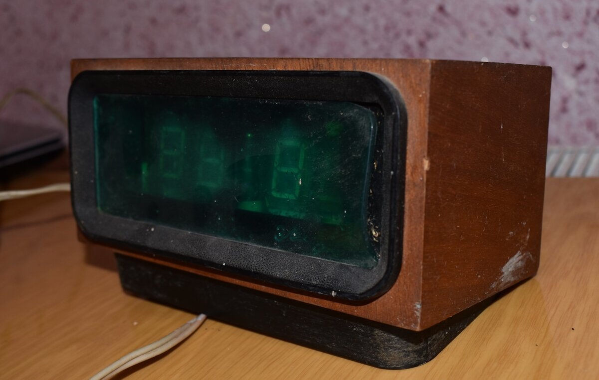 Видимо общество действительно развивается по спирали. Иначе чем объяснить постоянные всплески спроса на различные товары в ретро стиле. Похоже та же ситуация с ламповыми часами. При очередном визите, мой друг Сергей Егоров вручает мне сверток с просьбой проверить работоспособность. Разворачиваю, а там шик конца 70х -часы на вакуумных люминесцентных лампах-"ЭЛЕКТРОНИКА-4"! Часы были покрыты слоем пыли, а что внутри творится одному богу известно. Перед включением решили открыть и убедиться, что там не висит на микросхеме трупик таракана, замыкая контакты. Ну и заодно сделать профилактику электронике. Эти часы с 1978 года выпускали на Ставрополье Мы конечно заглядывались на это чудо прогресса, приятно моргающего с витрины магазина, но цена 70 рублей напрочь отбивала желание отказаться от механического будильника. Тем не менее находились знакомые, которые раскошелились на ползарплаты и гордо рассказывали как они приятно светятся в темноте. Практически через год, в 1980 году подешевели рад
