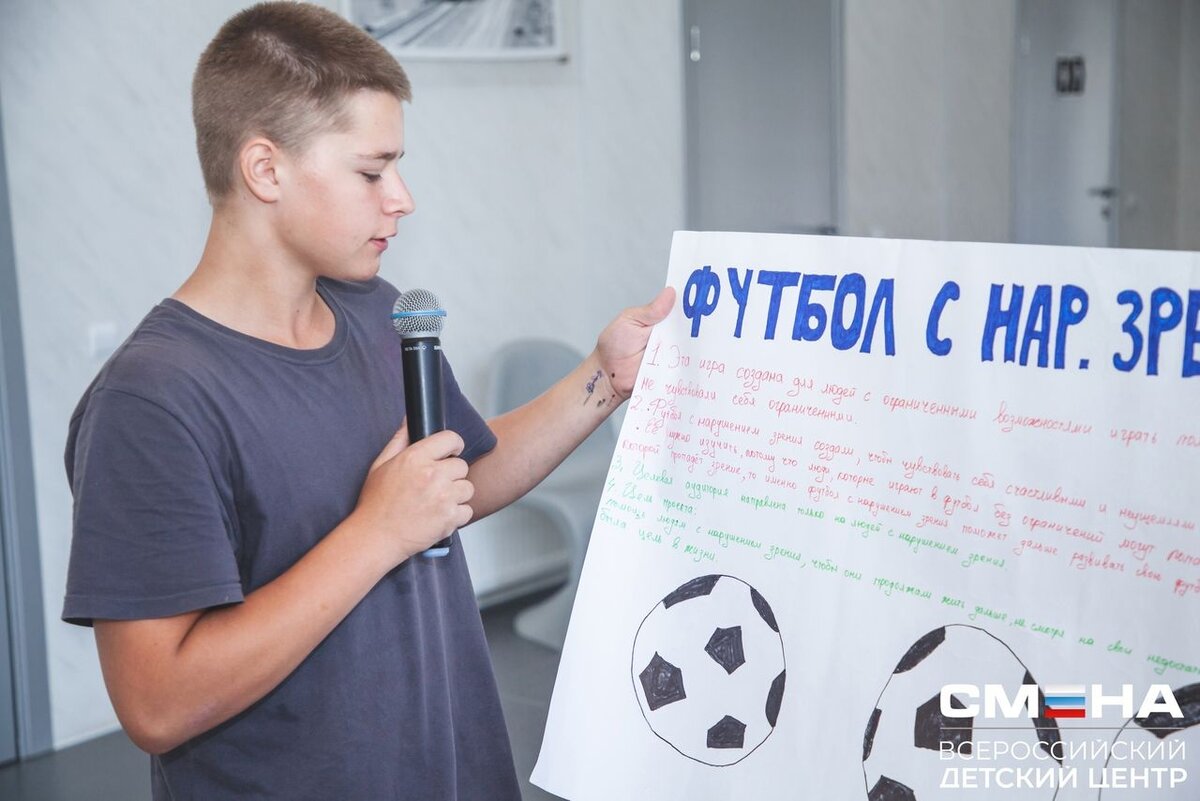 Участники программы «Олимпийская академия» в течение смены не только достигли новых результатов в спорте, но и активно работали над проектами о физкультуре и здоровом образе жизни. На защите сменовцы представили 5 практико-ориентированных проектов. Проектная деятельность - часть образовательной программы «Олимпийская академия». Теоретические занятия развивают мышление, учат ребят определять проблему, цель, задачи проекта. «Мы подготовили проект, посвященный футбольным клубам для людей с ограничениями по зрению. В Москве уже проводятся такие тренировки и соревнования, но хотелось бы поддержать развитие этого вида спорта и на региональном уровне. В нашем отряде все любят футбол и очень бы хотели чтобы, он был включен в программу Паралимпийских видов спорта. Я, в свою очередь, готов участвовать в подготовке таких соревнований в своем родном городе в качестве волонтера», - поделился планами Лаврентий Сёмкин из города Кореновск Краснодарского края. Каждый отряд обозначил актуальность, цель