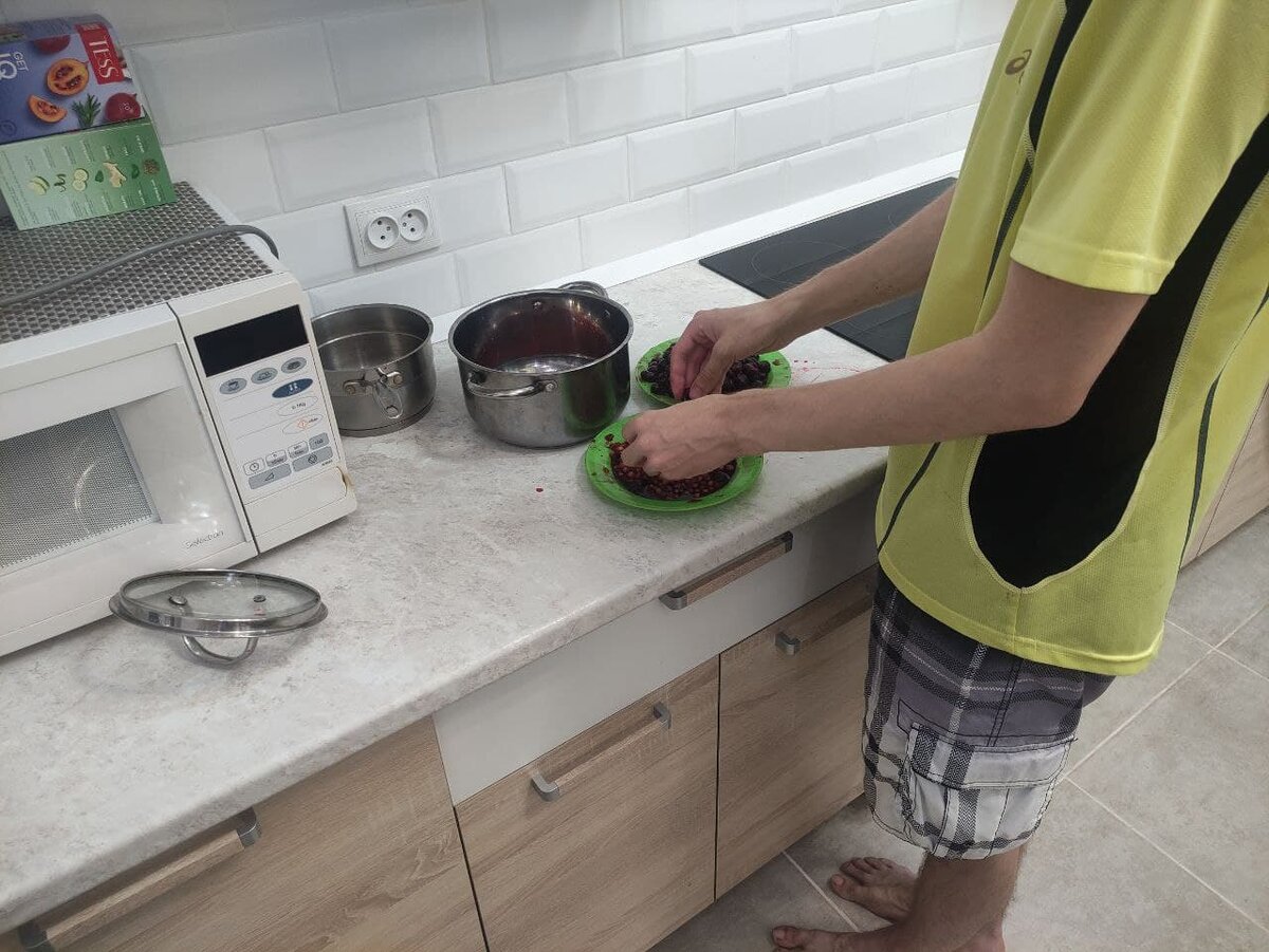 "Чистка вишни от косточек не самая лёгкая, быстрая и приятная работа", - я тоже так думал, пока не выявил для себя технику, которая позволила мне увеличить скорость чистки вишни от косточек в разы, при том, что я не использовал так называемые "самоделки", которые, на мой взгляд, в этом деле не совсем уместны. Я не претендую на звание "лайфхак года" или ещё чего-то, я просто хочу с вами поделиться тем, что мне действительно помогло и упростило мою работу. 1. Рабочее место В первую очередь я выбрал удобное рабочее место. Обязательным условием было то, что я буду перебирать ягоды стоя, чтобы угол обзора на вишню в кастрюле был больше. На рабочем месте у меня находились: кастрюля, тарелка для очищенной вишни и для косточек. Я разместил их так, чтобы мне было комфортно в самом процессе: взял вишню почистил и тут же отложил. 2. Большая ёмкость Моя задача была работать в две руки, поэтому я взял большую ёмкость, чтобы мне было удобно брать вишню, при том одновременно. 3. Работал в две руки Эт