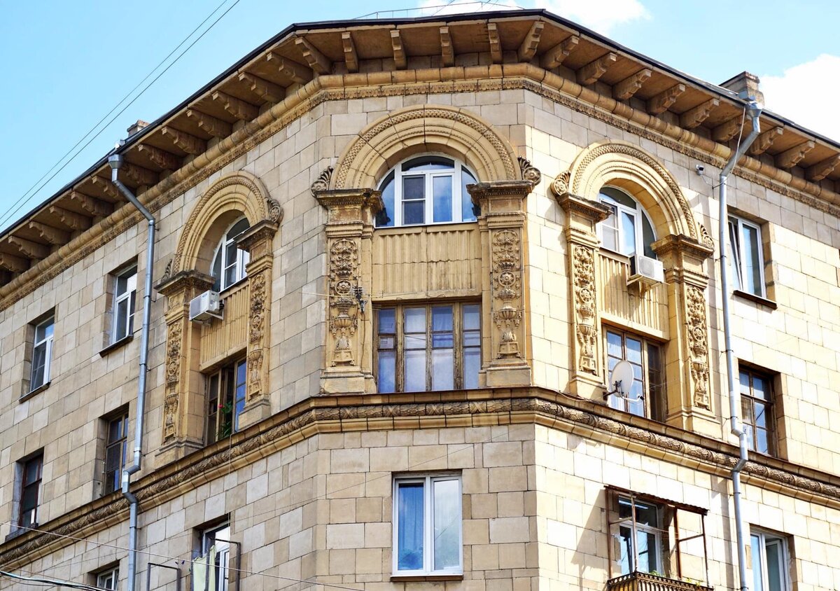 Неподалёку есть дом с барельефами то ли шишек, то ли ананасов. По видимому в нём жили какие-нибудь агрономы или деятели Минсельхоза.