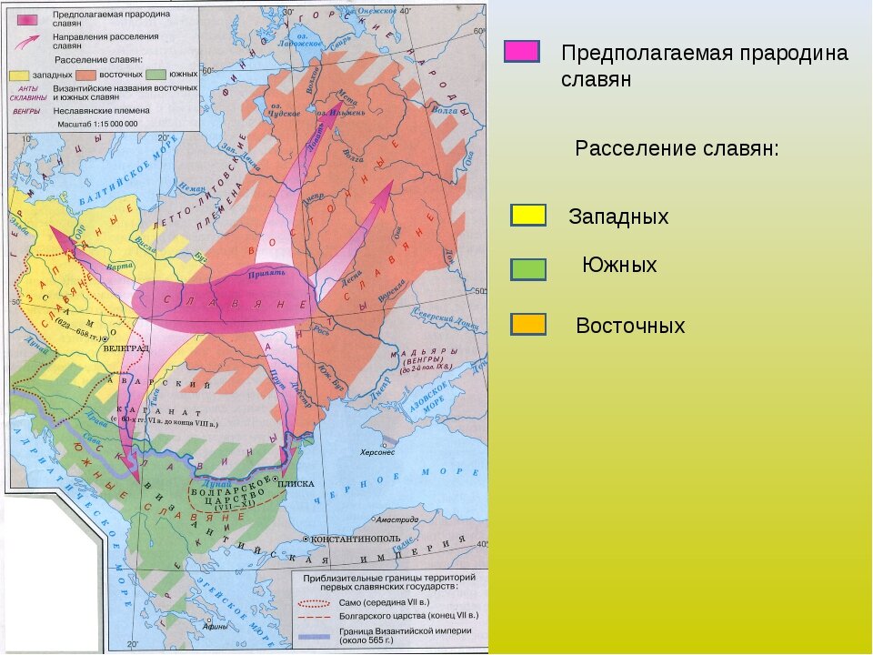 Прародиной ранних славян является территория к востоку от германцев-от р. Одер до Карпатских гор В различных источниках праславян называли венедами. III-VI вв н. э. - эпоха великого переселения народов. Поляне - среднее течение Днепра - Киев Северяне - к Северу от полян между Десной и Росью - Чернигов Древляне - к западу от полян - в лесах Дреговичи - к северу от древлян - между Припятью и Западной Двиной Полочане - соседи дреговичей Бужане и Волыняне - к югу от р. Буг - потомки дулебов Уличи - междуречье Прута и Днепра Тиверцы - между Днепром и Южным Бугом Вятичи - по р. Оке и Москве Кривичи - к западу от Вятичей Радимичи - по р. Сожь и её притокам Хорваты - северная часть Карпатских склонов Ильменские словене - вокруг оз. Ильмень (Новгородцы) Русь - возможное название одного из племенных союзов живших по реке Рось, уноследованное полянами. Путь "Из варяг в греки" - своеобразная столбовая дорога связывавшая Северную и Южную Европу. Возник в конце IX века. Маршрут : Балтийское мор
