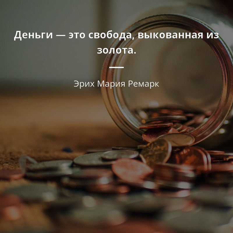 Жизнь скучна и однообразна. Но всё меняется, когда приходят ОНИ… – деньги на карточку! Деньги — не самоцель, они лишь отражают вашу творческую энергию и уверенность в себе. Эрни Зелински Хочешь заработать деньги, чтобы жить счастливо, и в итоге все силы, весь цвет жизни уходят на их добывание. Счастье забыто, средство принято за цель. Альбер Камю Нельзя полагаться на доходы, которые мы только надеемся получить, какими бы верными они нам не казались. Мишель де Монтень. Красивая женщина для глаз – рай, для души – ад, а для кармана – чистилище. Бернар де Фонтенель Время – деньги. Бенджамин Франклин Люди работают, чтобы получать деньги. Деньги – средство достижения свободы. Если с удовольствием заработанные деньги позволяют наполнить жизнь впечатлениями и удовлетворить страсть к познанию, жизнь удалась. Если ты работаешь так, что света белого не видишь, зачем ты работаешь? Евгений Чичваркин Не почитай денег ни больше, ни меньше, чем они того стоят; это хороший слуга и плохой господи