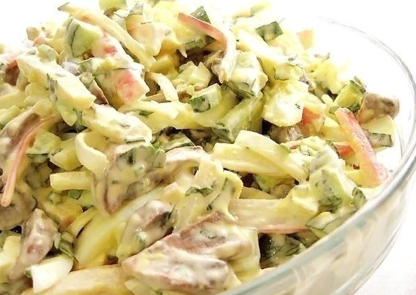 Очень простой и вкусный салат с крабовыми палочками и жареными шампиньонами. По вкусу он похож на крабовый, но грибы придают потрясающий вкус этому салату. Нам понадобится: 750 г шампиньонов 400 г крабовых палочек 5 крутых яиц 4 свежих огурца майонез или йогурт зелень петрушки 1-2 шт. репчатого лука Приготовление: Грибы и лук нарезать, обжарить вместе до готовности. Яйца измельчить. Огурцы нарезать кубиками. Крабовые палочки нарезать соломкой. Петрушку измельчить. Все ингредиенты соединить, посолить, заправить майонезом (йогуртом) и перемешать. Салат готов! Приятного аппетита! Подписывайтесь на мой канал, ставьте лайки!