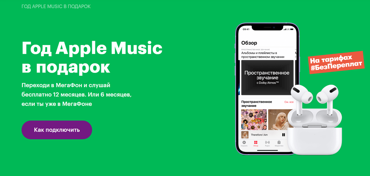 Мегафон представляет новую акцию, в ходе которой дарит своим абонентам подписку на Apple Music! У действующих клиентов уже "лежит" предложение в мобильном приложении в разделе "Для меня"! Абонентам других операторов необходимо либо перейти на Мегафон со своим номером, либо заказать новую сим-карту. Данным клиентам будет предложено целых 12 месяцев подписки на музыка! Все подробности и условия акции расположены по ссылке: megafon.ru/apple_music/