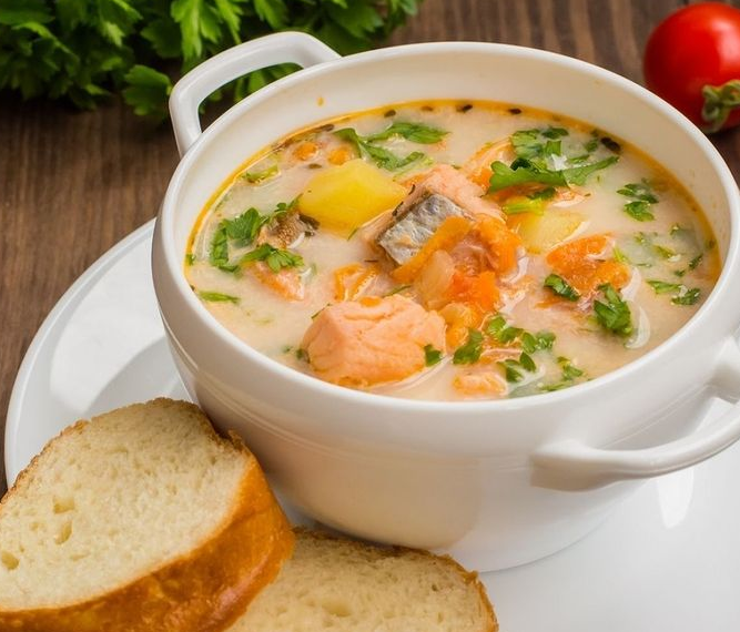 5. Семгу нарезать небольшими кусочками, добавить в бульон.