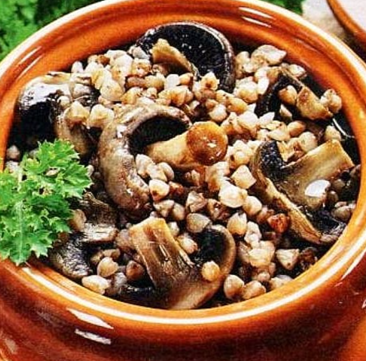 На дно горшочка (одного большого, если делаете порционно, делите) насыпать 150 гр СУХОЙ гречки. Гречка не должна быть варёной! Сверху выложить кусочки мяса. Сверху грибы с овощами. Если делаете порционн