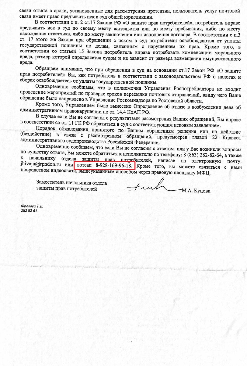 В ответе Управления Роспотребнадзора по Ростовской области указано о том, что если Вы не согласны с ответом или у Вас возникли вопросы по существу ответа, Вы можете обратиться к исполнителю по телефону: 8 (863) 282-82-64, а также к начальнику отдела защиты прав потребителей, написав на электронную почту: jhivaja@rpndon.ru или вотсап 8-928-169-96-18. Кроме того, вы можете связаться с нами посредством видеосвязи, вышеуказанным способом через правовую площадку МФЦ. Попытка дозвониться не увенчалась успехом. 03.08.2021 пишу, а WhatsApp показывает, что абонет был последний раз в сети в 30.07.2021. Отлично) 05.08.2021 мне реально ответили. работает)))