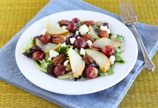 Молоко с творогом сыр и сахар смешать до однородной консистенции. Положите половинки груши на листья салата листья срезать стороной вниз и