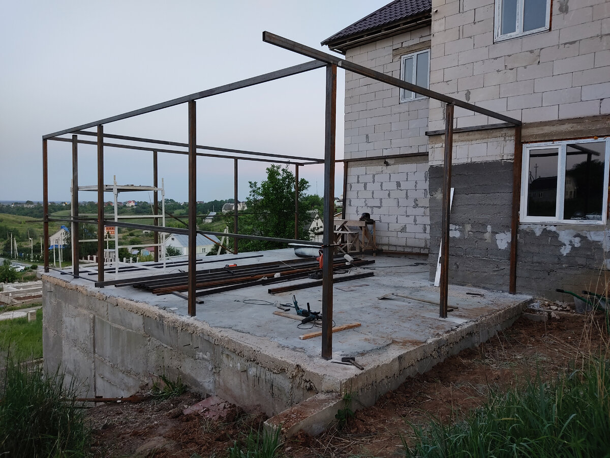 Всем привет. На этот раз предстояла достаточно сложная задача - необходимо было сделать беседку на крыше гаража который примыкает к дому и находится уровнем ниже. Гараж огромный площадь около 65 м.кв. Делать беседку меньшего размера не хотелось - тогда бы пришлось мудрить с гидроизоляцией пола беседки чтобы осадки не протекали в гараж. В общем из за габаритов 8*10м сделать скат крыши беседки одним профилем было не возможно(длинна ската 8,8м). Пришлось варить фермы. Изначально планировали использовать для ферм трубу 100*50, а для столбов 100*100, но как увидели ценник на металл скорректировали до 80*40 и 80*80 соответственно. Сначала надо было выставить по периметру столбы, и тут пришлось повозиться. Гараж оказался не правильной формы с нарушенной геометрией. Крепление к бетону нижней части столба сделали так: нарезали квадраты 85*85 из листа 3мм, просверлили в центре отверстие вставили арматуру длинной около 10см в это отверстие и обварили. Потом этот "гвоздь" забили в предварительно