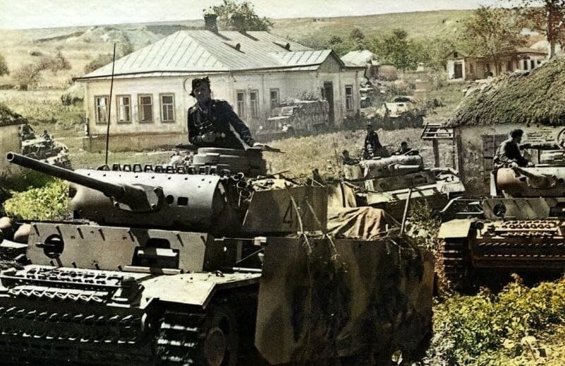 Немецкие экранированные танки Pz.Kpfw. III в советском селе перед началом операции «Цитадель»