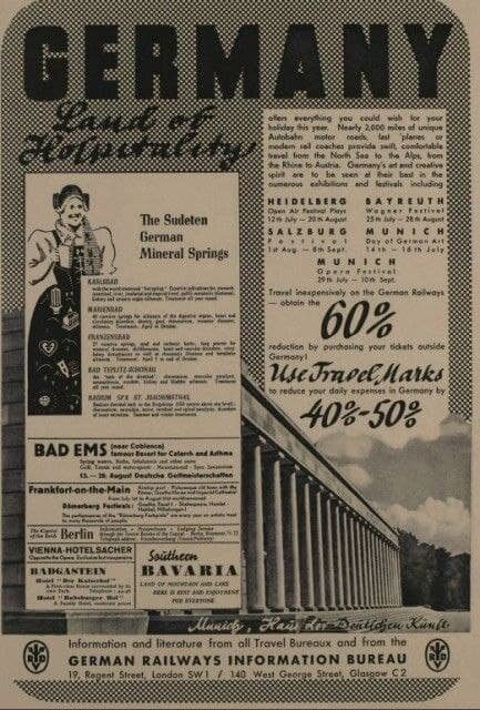 "Германия - страна гостеприимства". Реклама туристических поездок в газете "The Illustrated London News". 1939.