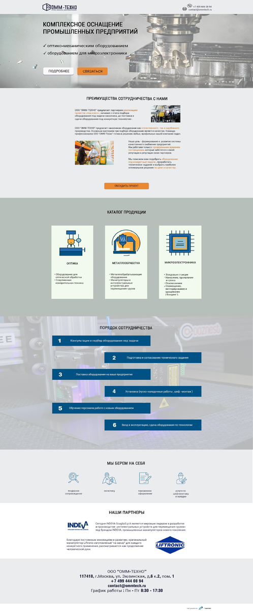 Новый сайт в копилку: https://ommtech.ru/ Одностраничник, переходы по кнопкам на разделы сайта. Срок исполнения: 2 недели Этапы работы: 1. Беседа с заказчиком или "бриффинг", как модно называть. 2. Написание и согласование текста, подбор визуала. 3. Отрисовка дизайна для десктопной и мобильной версий. Согласование с заказчиком. В итоге поменяли иконки и картинки. Макет десктопа: Мобильная версия: 4. Покупка домена, хостинга, настройка почты на домене. Сразу делали на HTTPS. 5. Верстка десктопной и мобильной версий. Чистый код HTML, что дает максимальную скорость загрузки сайта. 6. Подключение Вебмастера, Метрики, добавление сайта в каталоги. Верстка политики конфиденциальности и 404 страницы. 7. Тестирование и сдача. Вуаля, сайт готов. Можно хвастаться перед партнерами!