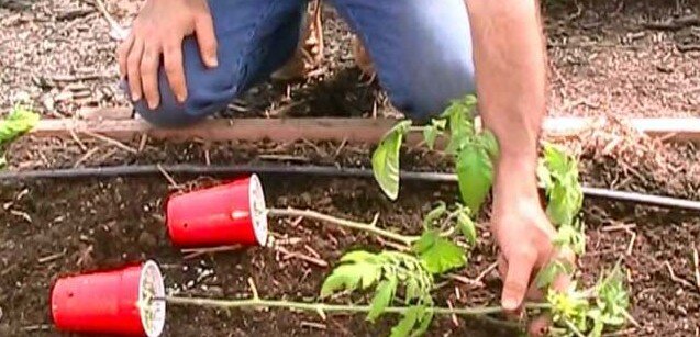 Если вы хотите наслаждаться своими собственными помидорами, вам нужно готовиться уже сейчас. В середине мая вам нужно будет выполнить еще одну важную часть работы. Пересадите их в грунт. Мой сосед - великий садовод, и его помидоры всегда были для меня непревзойденным образцом. Сегодня он рассказывает, как он это делает. 1. Вместо того чтобы сажать помидоры вертикально, он располагает их, как на фотографии, боком, чтобы листья касались земли. 2. Он посыпает пищевой содой почву вокруг рассады, примерно 4 столовые ложки на рассаду. Будьте осторожны, посыпайте не сами саженцы, а почву вокруг них. Видимо, благодаря соде помидоры становятся намного слаще. 3. Оставьте миски с водой возле рассады. Это не позволяет птицам утолять жажду, клюя помидоры и уничтожая урожай. 4. Он никогда не выбрасывает перезрелые помидоры. Он нарезает их и раскладывает на поверхности почвы, насыпанной в ведро. Через две недели у него появляются новые всходы.