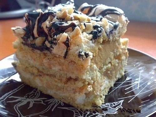 Крем: 200 г масла взбиваем с банкой варёной сгущенки. Половину крема мажем на первый корж, посыпаем столовой ложкой рубленых орехов.
