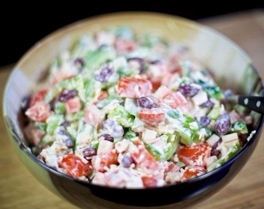 4. Для соуса смешать уксус, масло, горчицу, жидкий мед, толченый чеснок и тимьян и оставить на 30 минут. В миску выкладываем курицу, кукурузу, красную фасоль, зеленый перец, помидоры, петрушку, лук и заливаем соусом. (Я не добавляла горчицу - дети не любят, мед тоже не решилась добавить, остальное все добавила, все равно получилось очень вкусно!)