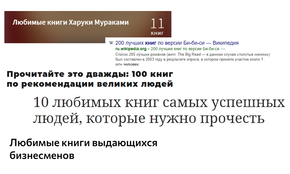 Уверен, что каждый их вас неоднократно встречал списки книг, которые составили какие-нибудь известные и успешные люди, ученые, писатели, блогеры, спортсмены или кто-то ещё. Чаще всего я просто пробегаюсь глазами по такому списку, иногда встречу какого-нибудь нового автора или произведение. Считаю, что в большинстве своём эти списки больше ни для чего не пригодны. Прочитав список любимых книг какого-нибудь успешного человека, вы, в любом случае не повторите его путь. Даже, если пойдете к той же цели, ваш опыт всё равно будет иным. Жизнь меняется, обстоятельства и люди вокруг нас тоже. Успех каждого уникален и неповторим. И сколько нужно ещё поломанных судеб людей, которые, начитавшись историй о Стиве Джобсе, Уинстоне Черчилле или Ричарде Бренсоне, забили на учебу и потихоньку скатились на социальное дно, чтобы понять это? Уникальность опыта никогда не даст вам понять, почему тот или иной человек создал именно такую подборку книг (фильмов, историй, да хот анекдотов). Не всегда даже схожи