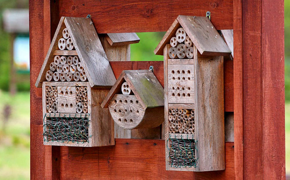 В последнее время стала популярной идея устанавливать в саду так называемые домики для насекомых, напоминающие всем известные скворечники. Только вместо отверстия с жердочкой, на передней стенке у них имеется несколько горизонтальных или вертикальных узких прорезей. Впрочем, фасада может и вовсе не быть. В этом случае домики похожи на ящик, разделенный перегородками на множество разнокалиберных ячеек. Заполнением для них служат самые разные природные материалы, назначение которых — образовать для жильцов как можно больше укромных уголков, тоннелей и норок на любой вкус. Как правило, у покупных изделий дело ограничивается опилками, мелкими дощечками с отверстиями и бамбуковыми палочками. Глухие домики с четырьмя стенками продаются без наполнения, и владелец сам оформляет их «интерьер» через съемную крышу. Для этого подойдут уложенные рядами стебли тростника и злаков, камыш, шишки, деревянная стружка, кора, мох, сухие цветы и травы, мелкие камушки и даже гофрокартон и поризованный кирпич.