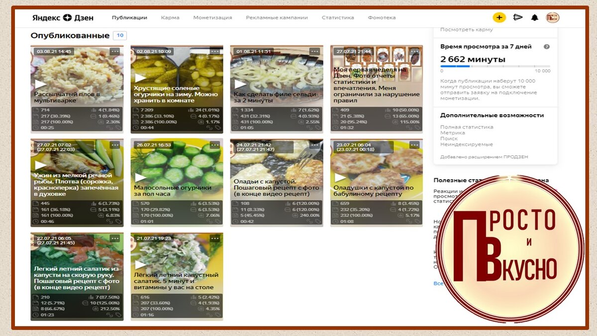 Ровно 2 недели прошло с момента создания канала, но если вычесть период в течении которого он был ограничен, то по факту он развивается всего неделю. Добрый день, дорогие друзья. Приветствую вас на канале: "Просто и Вкусно"! Подписчики Начать свою статью я хочу именно с вас, мои дорогие ПОДПИСЧИКИ! Каждому из вас я очень благодарна за оказанное доверие. Я если честно, поражена, как быстро увеличивается это число. За первые 3 дня после создания канала подписалось, аж 8 человек. Остальные пришли на канал после снятия ограничений, то есть в последние 4 дня. Сегодня на канале 27 человек! Аудитория Тоже увеличивается в геометрической прогрессии. За первые три дня она выросла до 108 человек, и в последние 4 дня после снятия ограничений до 1002 человек! Спасибо, что смотрите мой канал! Минуты В первые 3 дня цифра поднялась до 570 минут, а затем полностью сгорела из-за того, что канал стоял. После снятия ограничений, цифры начали медленно, но уверенно идти вверх и сейчас на счетчике: 2662 ми