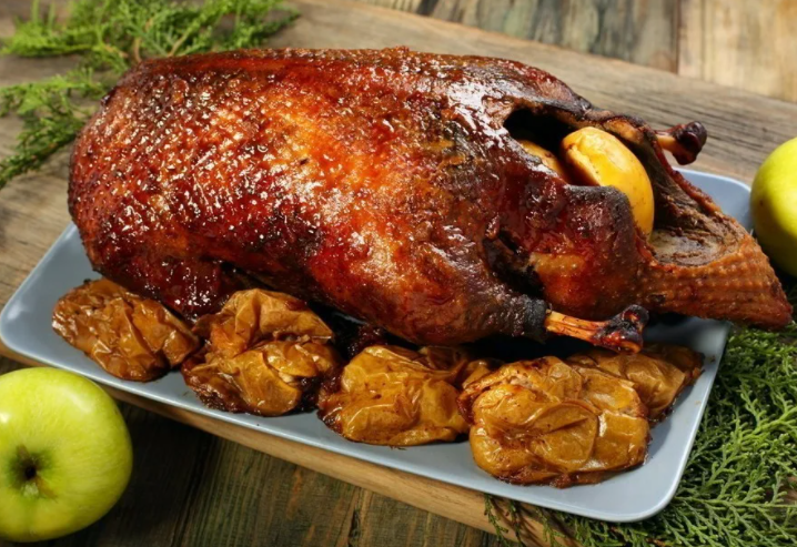 6. Утку отправить запекаться, через 1,5 часа раскрыть фольгу, проколоть бедро, если кровь выходит, дожарить еще пол часа. Через пол часа снова проколоть, если сок стал прозрачным, готово. Если нет, запекайте еще нужное время.