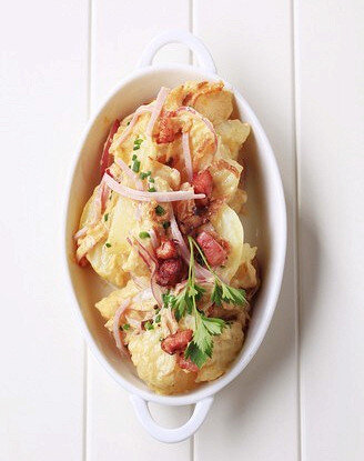 ИНГРЕДИЕНТЫ Крупная соль по вкусу Свежемолотый черный перец по вкусу Молодой картофель 700 г Бекон 3 куска Красный лук 1 головка Белый винный уксус 4 столовые ложки Зернистая горчица ИНСТРУКЦИЯ ПРИГОТОВЛЕНИЯ 1. В кипящей подсоленной воде отварить картофель до готовности. Слить, охладить и порезать на половинки. Переложить в миску. 2. В сковороде, на среднем огне, обжарить нарезанные тонкими полосками ломтики бекона до хрустящего состояния. Добавить нарезанный полукольцами лук и обжарьте, помешивая, до мягкости 2–4 минуты. Снять с огня и вмешать 3 столовые ложки уксуса и горчицу. 3. В теплую картошку выложить соус с беконом и перемешать. Посолить и поперчить. По желанию добавить еще уксуса. Подавать теплым. Еще больше рецептов на сайте eda.ru