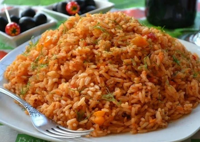 Мама готовила такой рис с томатным соком и луком пореем.