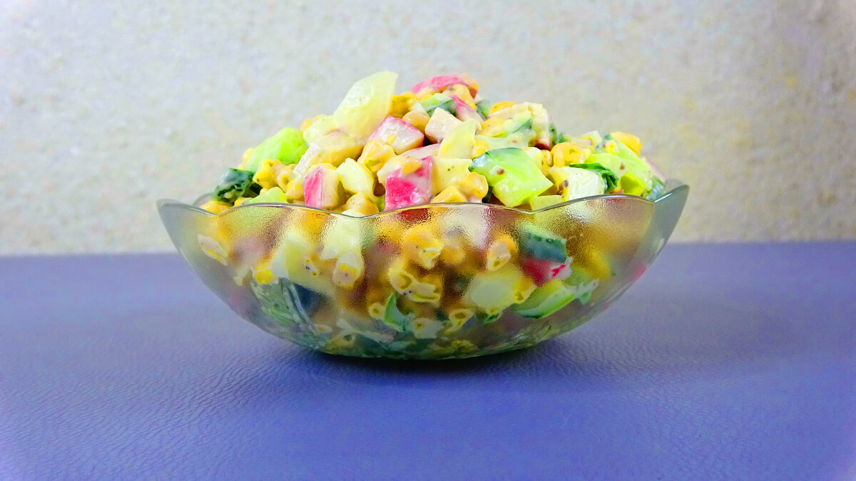 Все любят на праздники, чтоб на столе было много блюд. Но в жару, готовить сложно. Поэтому стараюсь готовить простые блюда. Сегодня предлагаю вам попробовать очень простой салат с крабовыми палочками и свежими огурцами. Конечно же многие знают этот салат и готовят его, но есть и те, кому рецепт пригодится. Заинтересовались? Тогда приглашаю вас к себе на кухню, где я покажу и расскажу как, я готовлю этот салат. ВИДЕО РЕЦЕПТ ПОШАГОВОЕ ПРИГОТОВЛЕНИЕ С ФОТО: Нарезаю крабовые палочки сначала вдоль, а потом поперек, на небольшие кубики. Складываю в глубокую чашу. Огурцы нарезаю некрупно и добавляю их в чашу, к крабовым палочкам. Следующим ингредиентом будут отваренные за ранее яйца. Их так же, нарезаю некрупно. Мелко нарезаю зеленый лук и отправляю к остальным ингредиентам. В качестве заправки я смешиваю майонез с горчицей с зернами. Именно эта горчица придаст салату нотку пикантности. Добавляю в чашу консервированную кукурузу. Солю и перчу. Заправляю салат заправкой и перемешиваю. Вкусный