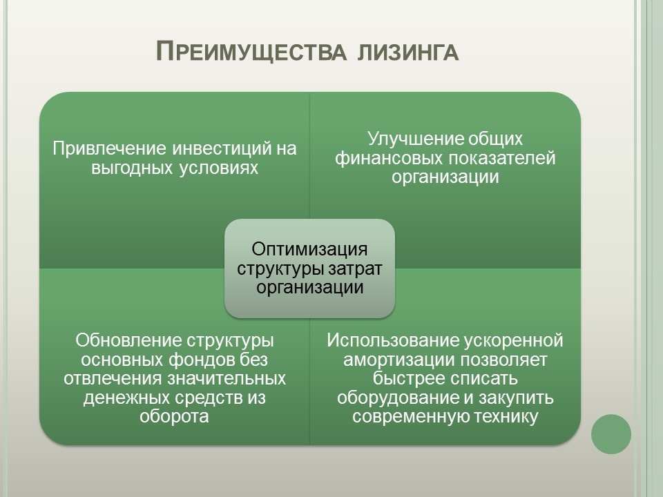 Лизинг – это форма финансирования, которая обладает целым рядом финансовых преференций для клиента по сравнению с кредитованием: получение финансирования через лизинг значительно проще и намного реже требуется дополнительное залоговое обеспечение, так как лизинговая компания будет являться собственником имущества до окончания срока лизинга; лизинг помогает быстро и доступно приобретать имущество, необходимое для развития бизнеса, без существенного отвлечения собственных оборотных средств лизингополучателя; договор лизинга заключается, как правило, на 2-3 года, что примерно соответствует сроку окупаемости предмета лизинга. В случае, если предметом лизинга является имущество с более длительным сроком окупаемости, то договор лизинга может быть заключен и на 4-5 лет. Не все кредитные организации готовы к таким срокам кредитования; приобретение имущества в лизинг улучшает структуру баланса лизингополучателя за счет учета предмета лизинга на забалансовых счетах и отсутствия необхо