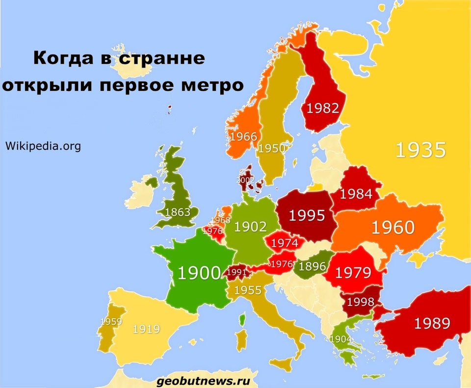 Всем привет, сегодня вы увидите разные нетипичные карты Европы которые мне удалось найти. 1 карта Как можно понять первое метро появилось в Лондоне, В СССР оно появилось только в 1935, а самое последнее метро в Европе открыли в 2002 в Дании. 2 карта Видно что германия главный гегемон Европы по экспорту, почти все странны под ней на этой карте, в России же преобладает Китай. 3 карта Тут закономерность нет, сказать особо нечего, кроме того что индусы в Англии меня удивили, как и поляки в Исландии. 4 карта Если посмотреть на Финляндию, Эстонию и Латвию получиться о мой бог. Сказать опять же нечего, оставлю вам на рассмотрение . 5 карта По этой карте видно что минимальная зарплата в германии в 10 раз больше! Восточная и южная Европа так же мало получает, а рекордсмен это Швейцария, 22 доллара в час.