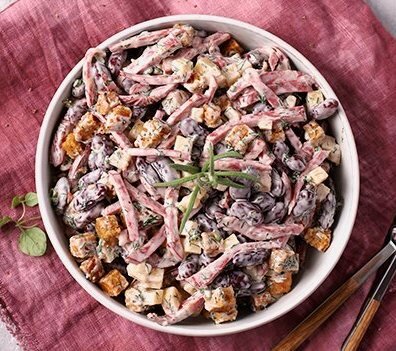 Доброго времени суток, Уважаемые читатели! С вами Дядя Стас и сегодня я решил поделиться с Вами тремя своими самыми любимыми салатами для праздничного застолья. Хорош ля-ля и погнали. Салат №1 Для приготовления нам понадобится: Приготовление: Для начала нам понадобится глубокая миска. Нарезаем сервелат полосочками, складываем в миску. Промываем грибочки, нарезаем слайсами, обжариваем, остужаем и добавляем к сервелату в миску. Открываем банки с кукурузой и фасолью, сливаем жидкость и отправляем в миску. Корнишоны консервированные нарезаем мелким кубиком и добавляем в миску. Сверху натираем на мелкой терке сыр. Зубчик чеснока пропускаем через чеснокодавку, смешиваем с майонезом и заправляем в салат. Тщательно перемешиваем все ингредиенты. Перед подачей на стол выкладываем сверху сухарики. Вот такой очень вкусный салат получился. Салат №2 Для приготовления нам понадобится: Приготовление: Берем салатник, в котором будем подавать салат на стол. Нарезаем ветчину, как нравится. Выкладываем в