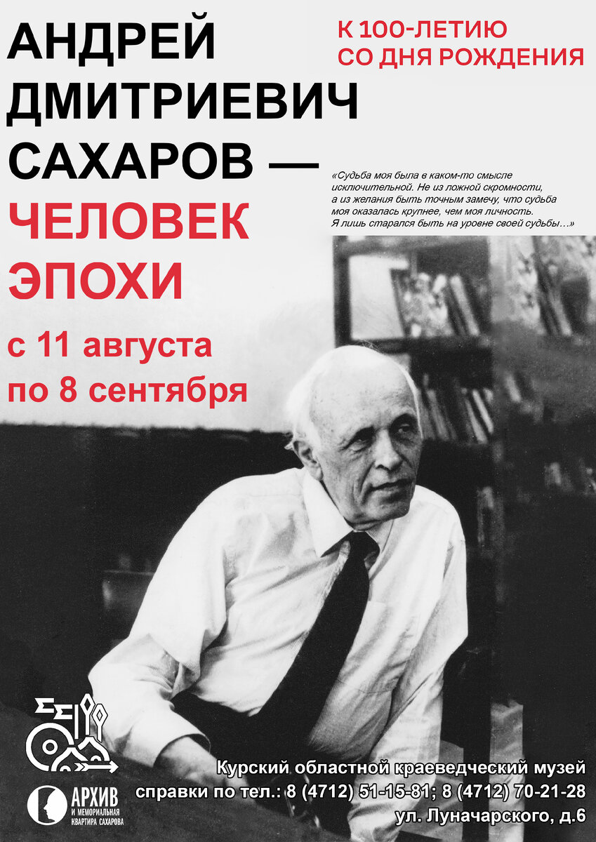 🌐С 11 августа по 08 сентября 2021 г. в Курском областном краеведческом музее будет работать выставка «Андрей Дмитриевич Сахаров - человек эпохи», подготовленная Архивом Сахарова г. Москва. 🌐Академик Сахаров - имя из школьного учебника. Выдающийся ученый-физик, общественный деятель, правозащитник и гуманитарный мыслитель планетарного масштаба. Его жизнь и деятельность были неразделимо связаны с величайшими историческими процессами второй половины ХХ века, определившими будущее не только нашей страны, но и всего человечества. Человек, которого называли отцом советской водородной бомбы, он получил Нобелевскую премию мира «за бесстрашную поддержку фундаментальных принципов мира между народами и за мужественную борьбу со злоупотреблениями властью и любыми формами подавления человеческого достоинства», а в своей стране он был противником политического режима, гонимым за отстаивание тех принципов, которые в наши дни лежат в основе Конституции России. 🌐Выставка, построенная по хронологическ