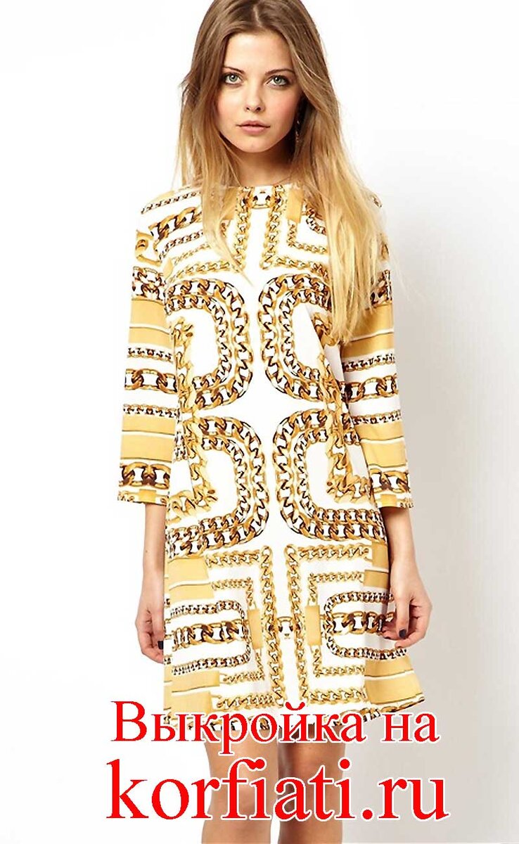 В этом платье трапеция с рукавами ¾, солирует, бесспорно, принт ткани. Золотые цепи разного размера выложенные замысловатыми узорами, создают невероятный эффект, превращая простое по форме платье силуэта трапеция, в настоящий шедевр! Сшить такое платье достаточно просто, даже имея небольшой опыт в шитье. По спинке платья нет шва, а чтобы платье было удобно надевать, вшита короткая металлическая застежка-молния. Рукава — прямые, длиной чуть ниже локтя. В материале: -Платье трапеция – простая выкройка