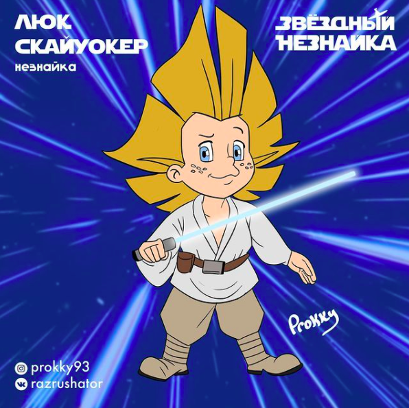 Привет-привет, читатели! Продолжаем тему советских мультяшек и как их видоизменяют современные иллюстраторы. На этот раз посмотрим на то, как некто под ником prokky93 создал целую серию иллюстраций где показал персонажей из Незнайки в образах героев из Звездных Войн. Всего картинок семь. На них изображены Незнайка, Знайка, Пончик и другие узнаваемые герои из знаменитого мультика. Выглядит так будто мультяшкам просто пририсовали другие костюмы и все, хотя нет, есть и те, к которым подобрали наряд весьма подходящий, поэтому смотрится достаточно эффектно. Хотя чего я все тут вам рассказываю, лучше уже показать, поэтому лучше уже покажу. Начнем с самих Незнайки и Знайки. Кто смотрел Звездные Войны, как думаете, в образах каких персонажей их изобразил иллюстратор? Есть хоть какие-то предположения? Если есть, напишите потом, когда прочтете статью в комментариях удалось ли вам угадать в чьих образах предстали персонажи! Итак, Незнайка и Знайка! Да-да, Незнайка в роли Люка Скайуокера, а Зна