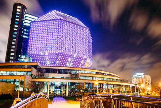 Национальная библиотека является визитной карточкой Беларуси. Сегодня это не только хранилище с огромнейшим собранием книг, но и мультифункциональный центр, в котором совместились высокие технологии, необычная архитектура и ультрасовременный дизайн. В 1989 году был проведён всесоюзный конкурс на создание лучшего проекта будущей постройки. Архитекторы, победившие в конкурсе, предложили взять за основу модель «белорусского алмаза», в котором сочетались функциональность и современный дизайн. Идея предполагала возведение неповторимого здания в виде ромбокубооктаэдра (в просторечии «алмаз») из 18 квадратов и 8 треугольников, поверхность которых должна быть покрыта стеклом. Библиотека в форме огранённого алмаза по задумке символизирует бесконечность познаваемого мира и ценность знаний. Грандиозное строительство началось лишь в 2002 году, в нём было задействовано 5000 человек и 200 различных организаций. Работы велись 24 часа в сутки, а в напряжённые моменты на стройке присутствовало до 3000