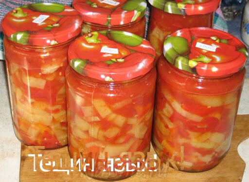 Хочу порекомендовать вам рецепт салата из кабачков "Тещин язык" Для любителей острых ощущений этот салат зимой будет в самый раз.Остроту регулируем естественно перчиком по своему вкусу. Нам понадобится : кабачки(молодые,ну можно использовать и большие)-3кг,морковь-3шт,сладкий перец-3шт,острый перец-1шт,чеснок-100гр,томатная паста-500гр,сахар-180гр,растительное масло-200мл,соль крупная-2ст,л,уксус-180мл, Из этого количества ингредиентов получается 5литров готового салата.Кабачки надо резать длинными пластинками,морковь натереть на крупной терке,перец сладкий соломкой,острый перец мелко нарубить с чесноком.Сложить все овощи в кастрюлю или таз, добавить все специи к овощам. Перемешать и оставить на час,чтобы кабачки пустили сок. Поставить вариться .После закипания проварить примерно 40 минут,постоянно помешивая. Добавить уксус,проварить минут 10 . Готовый салат разложить по стерилизованным банкам . прекрасная закуска готова!
