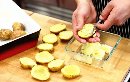 Сегодня готовим куриную грудку запеченную в картофеле. Это отличный вариант очень вкусного, ароматного и сытного ужина для всей семьи. Готовить такое блюдо очень просто и быстро. Ингредиенты: картофель среднего размера - 8 шт.; куриная грудка - 300 г; лук - 1 шт.; чеснок - 2 зубчик; грибы - 200 г; твердый сыр; копченый бекон - 100 г; куриная приправа. Процесс приготовления куриной грудки запеченой в картофеле Картофель вымыть, обсушить. Поставить в разогретую до 180 ° C духовку примерно на 45 минут. Когда она станет мягкой, дайте ей остыть. Разрезать пополам и сделать углубление. Вымойте куриную грудку, нарежьте ее кубиками и посыпьте приправой для курицы. Это придаст мясу более выраженный вкус и сохранит сочность курицы. Бекон нарезать кубиками и обжарить на сковороде, пока не растает жир. Убрать со сковороды лишний жир, добавить нарезанную куриную грудку. Поджарьте их ненадолго, чтобы внутри они остались сырыми. Лук нарезать ломтиками, грибы вымыть и разрезать пополам. Чеснок мелко н