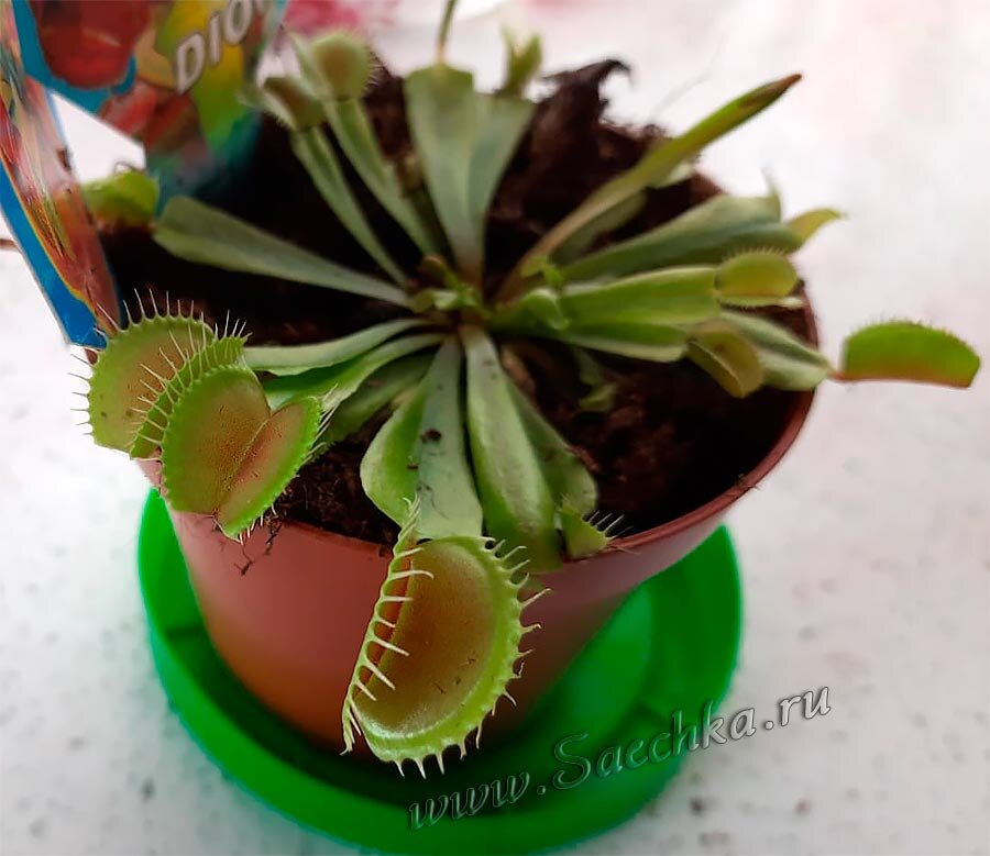 На прошлой неделе мотались с мелкой в строительный магазин, где она себе углядела новую растюху. Вот такую: Я вначале отказалась покупать, т.к. подумала, что за ней сложный уход. Собственно, я и сейчас не совсем в этом уверена... Это Дионея Мухоловная (Dionaea Muscipula) или «Венерина мухоловка». Попросту говоря, хищное растение, которое ловит мух, муравьев, жучков и прочих насекомых. Я ещё рта раскрыть не успела, мелкая стаскала новое растение в парник, где у меня куча муравьишек развелась. Тут один был закрыт в створках дионеи. Принимаю любые советы по уходу. Самое главное: как дионея переживает зиму, когда никаких насекомых нет? Завтрак