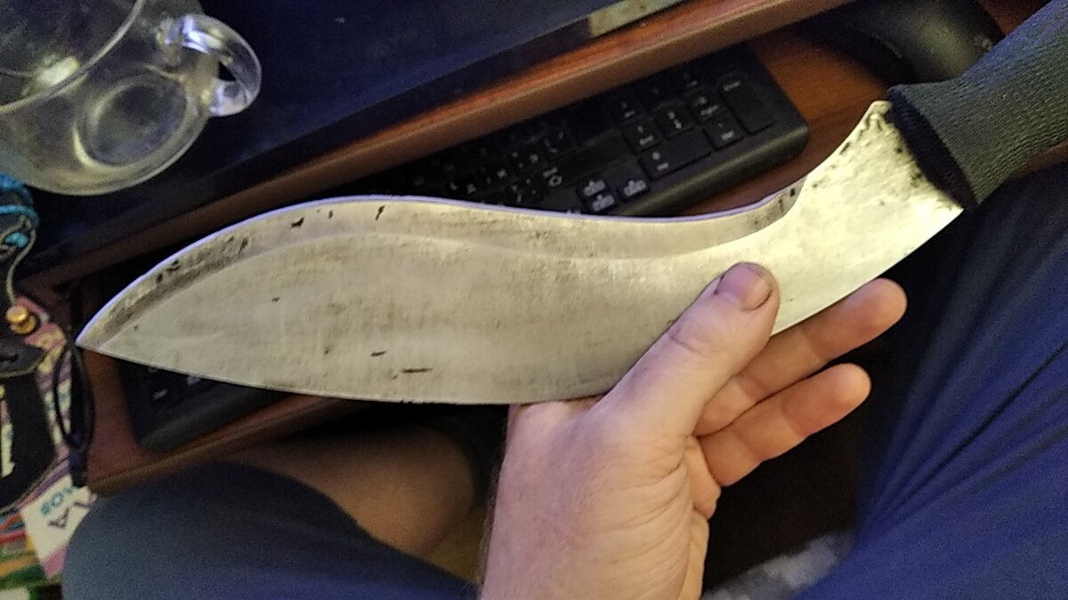 Нож типа "кукри", фирмы Viking. С моей точки зрения, сделан излишне большим и тяжёлым. Но именно поэтому нашел свою нишу применения. Куплен лет 10 тому, изначально имел полимерное покрытие, которое меня здорово раздражало, потому что быстро исцарапалось и потеряло вид. Поэтому было нещадно удалено. Несмотря на опасения в связи с дешевизной, оказался выполнен из неплохой нержавейки, заточку держит подолгу и неплохо рубит. Именно рубит, потому что в походах пеших по горам и выездах на авто в тайгу, используется в роли заменителя мачете или лёгкого топора. Для работ, требующих хороший рез, к нему в комплекте носятся другие ножи, обычно их с собой ещё два или более. Ножей ведь много не бывает, правда, коллеги-ножеманы?) На моем экземпляре изначально отсутствовали ножны, но это и плюс - послуживший основанием уценки, а купив его за приятную цену я быстро изготовил ножны из подходящего куска кожи. В качестве "единственного" ножа в лесу неудобен по приведенным выше причинам. Топор, опять же -